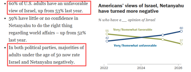民意层面,皮尤研究中心近期的民调结果显示,60%的美国成年人对以色列持负面看法,高于去年的53%。无论党派归属,50岁以下成年人中的大多数受访者对以色列及其总理内塔尼亚胡的评价都是负面的。