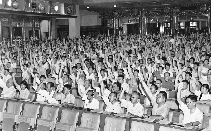 1955年7月5日至30日召开的第一届全国人民代表大会第二次会议,通过了中华人民共和国发展国民经济的第一个五年计划,图为大会现场。 新华社记者 钱嗣杰/摄