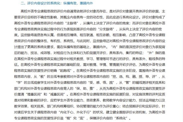 摘要:新时代高校外语专业课程思政的体系建设和质量优化紧扣立德树人根本任务,在高校外语专业课程思政的体系建设和质量优化中发挥着重要的支撑性、导向性以及激励性作用。合理、科学地构建高校外语专业课程思政评价体系既是高校外语专业课程思政的体系建设和质量优化的题中要义,更是破题的关键所在。本文围绕高校外语专业课程思政建设的根本目标,以专业教学目标、课程思政目标的达成度为观测坐标,从评价对象、评价内容、评价标准、评价方法四个维度全面切入,立体考察高校外语专业课程思政对学生知识、素质和能力“三位一体”教育教学效果的实现程度,为高校外语专业课程思政评价体系的构建提供指导。