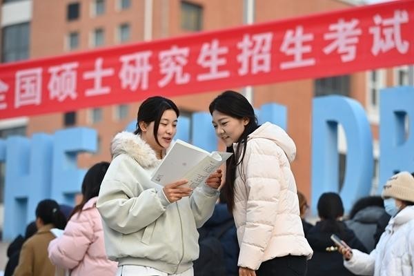 2025年12月20日,在山东省枣庄市实验小学考点,两名考研学生在考场外复习。视觉中国供图