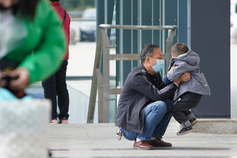 2022年1月18日,厦门北站进站口前,一对父子正在嬉戏玩耍。张海根 摄