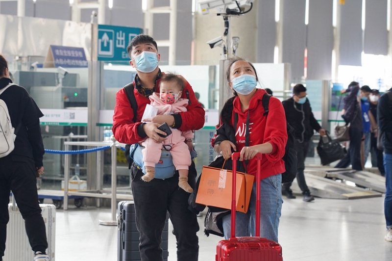 2022年1月27日,一位母亲抱着孩子前往南昌车站候车,孩子困了揉着眼睛。丁波 摄