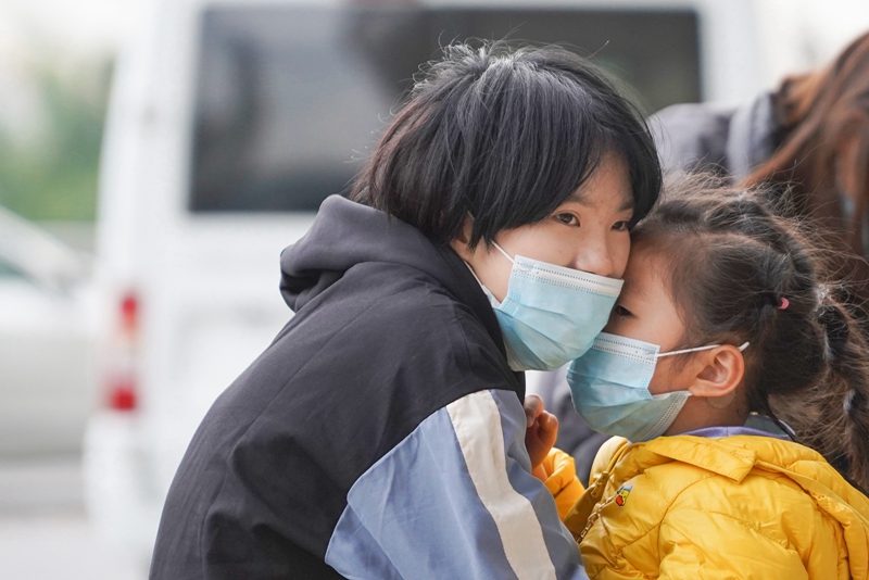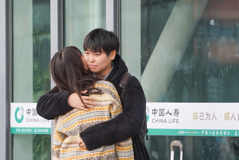 2022年1月18日,厦门北站出站口前,母女团聚相拥。张海根 摄