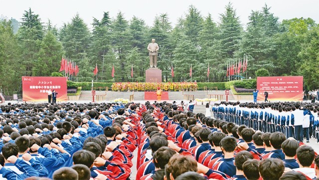 近年来,湖南以韶山为试点,打造“我的韶山行”红色研学品牌,创新思政教育模式,引导学生传承红色基因、坚定理想信念。图为2025年10月16日,“我的韶山行”红色研学开班仪式在韶山市毛泽东广场举行。 韶山思政教育实践中心供图