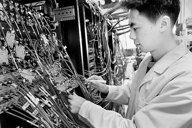 在中国科学院物理研究所实验室,科研人员在操作测控接线。新华社发