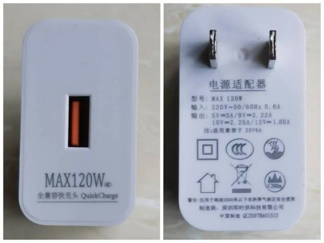 一款写有“120W”的快充头,实际最大输出功率只有22.5W。图片来源:封面新闻