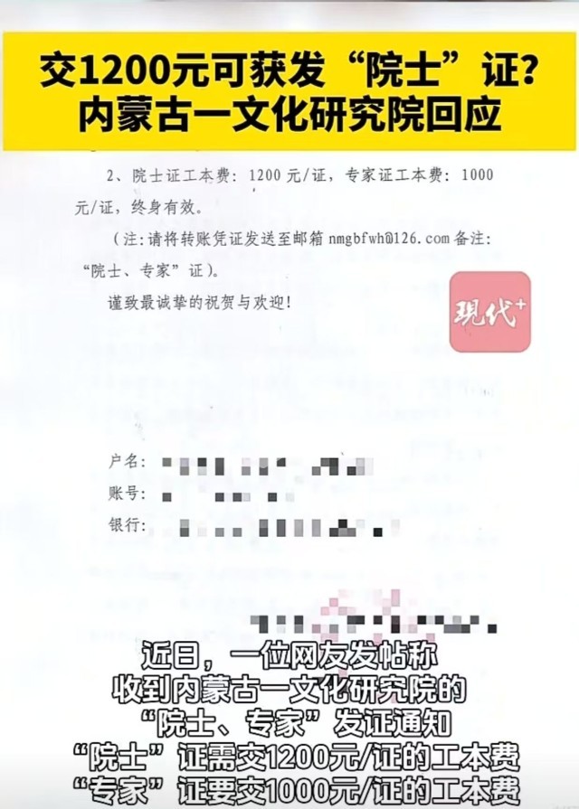 近日,网上传出消息称,内蒙古自治区北方文化研究院以1200元工本费向社会人员发放自制的院士证。据《现代快报》报道,内蒙古自治区文化和旅游厅已责令其立即退还费用并收回证书,同时封存相关台账资料,以配合后续调查,并将认真开展行业协会、学会等社会组织乱象专项整顿工作,全面开展相关排查,坚决堵塞监管漏洞,防止类似问题再次发生。