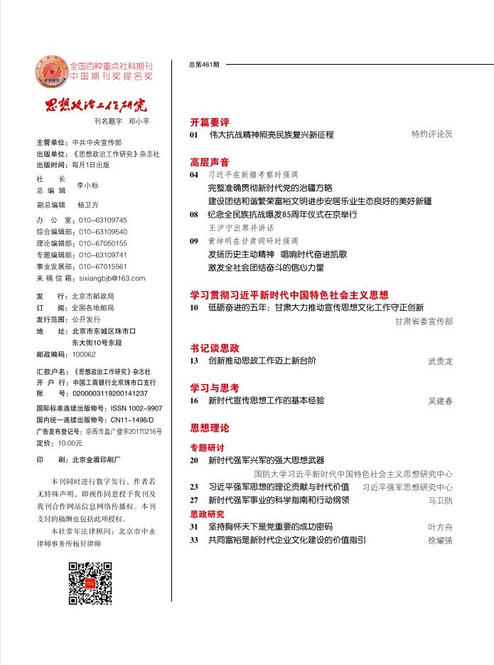 创新思想政治工作方式方法。一要强化全局思维。坚持做到教育跟着任务走、教育统筹整合抓、教育深入第一线、教育依靠群众搞。二要强化辩证思维。在教育计划上,统揽不统死;在教育时机上,随机不随意;在人员参与上,全员但不全体。既办好“流水席”、小群多路搞教育,又开好“小锅灶”、一课多点反复讲,确保人人都在教育中。三要强化创新思维。上好“三个课堂”:用“大学堂”抓好集中灌输,用“小课堂”搞好精准教学,用“微讲堂”开启“自助点餐”,让教育方法活起来。建好“三个平台”:建好智能手机教育平台、流动文化活动平台、实体身心服务平台,让教育载体实起来。用好“三种力量”:巧用上级力量保质保量落实,善用自身力量齐抓齐管实施,活用周边力量就近就便参与,让教育支撑强起来。四要强化系统思维。干部模范带动,既做理论宣讲者又做行动示范者,切实让群众听到的理、见到的人、看到的事相一致。
