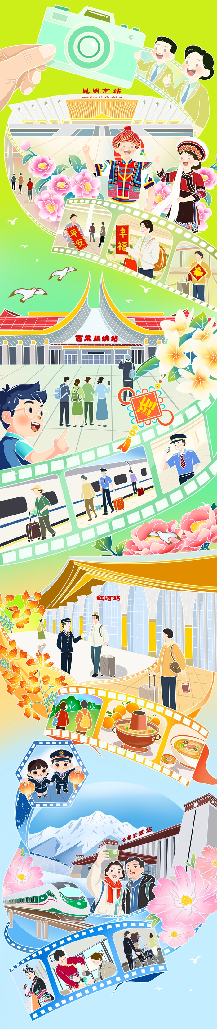 四季流转皆是景,一路欢歌赴团圆。云南铁路以地理之美、人文之韵、服务之暖,让春运不仅是归家之路,更是遇见云南的美好之旅。(文字/向攀 漫画/栗也茹 编辑/杨宇鑫